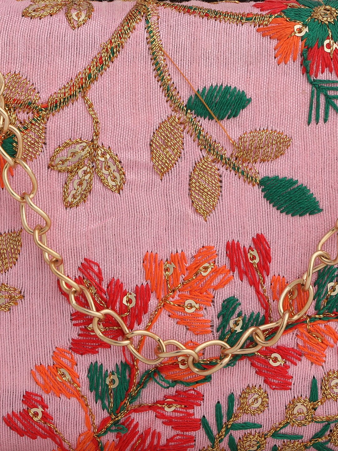 Pink & Gold Embroidered Box clutches, Has gold chain shoulder strap, 1 main compartment with twist closure